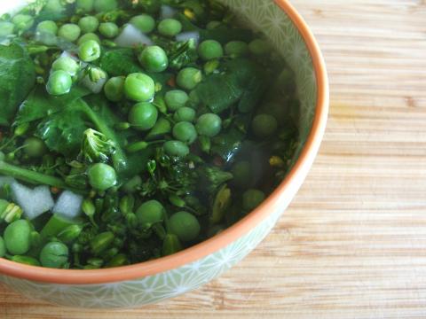 Dinner: Soup with peas, spinach, broccolini, green onion